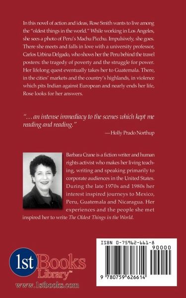 In this novel of action and ideas, Rose Smith wants to live among the "the oldest things in the world." While working in Los Angeles, a photo of Peru's Machu Picchu attracts her attention. "Stone city, blue sky. Home," she ruminates. Impulsively, she goes. There she meets a university professor, Carlos Urbina Delgado. They fall in love during a long trip down the dry Peruvian coast into the ancient mountain city of Cuzco. Through Carlos, Rose sees the poverty of the once-proud Inca, ponders the endurance of these and other indigenous peoples and wonders if the world can survive without them. Rose sees Los Angeles differently when she returns - as a city without a soul, divorced from its roots in early native people. Overcome by loneliness, Rose retreats into work. Slowly she moves forward in her quest. She rediscovers her passion for painting and joins in fighting for the rights of indigenous people. Carlos visits, but she has one more journey she must make: to Guatemala where the indigenous Maya have survived three decades of war. There, in the cities' markets and the country's highlands, in violence that pits Indian against European and nearly ends her life, Rose looks for her answers.