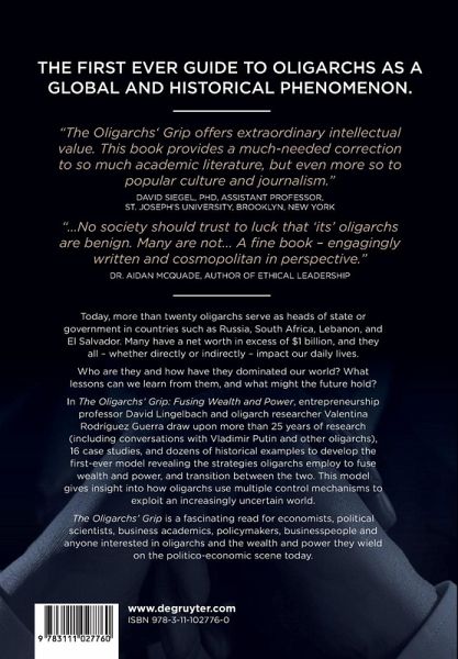 In The Oligarchs' Grip: Fusing Wealth and Power, entrepreneurship professor David Lingelbach and oligarch researcher Valentina Rodríguez Guerra draw upon more than 25 years of research (including conversations with Vladimir Putin and other oligarchs), 16 case studies, and dozens of historical examples to develop the first-ever model revealing the strategies oligarchs employ to fuse wealth and power, and transition between the two. This model gives insight into how oligarchs use multiple control mechanisms to exploit an increasingly uncertain world.