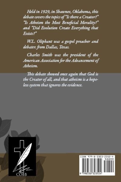 Held in 1929, in Shawnee, Oklahoma, this debate covers the topics of "Is there a creator?" "Is Atheism the most beneficial morality?" and "Did evolution create everything that exists?" W.L. Oliphant was a gospel preacher and debater from Dallas, Texas. Charles Smith was the president of the American Association for the Advancement of Atheism. This debate showed once again that God is the Creator of all, and Atheism is a hopeless system that ignores all the evidence.