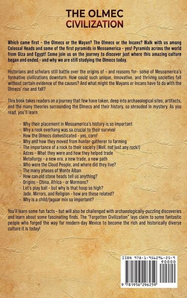 Which came first - the Olmecs or the Mayan? The Olmecs or the Incans? Walk with us among Colossal Heads and some of the first pyramids in Mesoamerica - yes! Pyramids across the world from Giza and Egypt! Come join us on the journey to discover just where this amazing culture began and ended - and why we are still studying the Olmecs today. Historians and scholars still battle over the origins of - and reasons for- some of Mesoamerica's formative civilizations downturn. How could such unique, innovative, and thriving societies fall without certain evidence of the causes? And what might the Mayans or Incans have to do with the Olmecs' rise and fall? This book takes readers on a journey that few have taken, deep into archaeological sites, artifacts, and the many theories surrounding the Olmecs and their history, so shrouded in mystery. As you read, you'll learn:Why their placement in Mesoamerica's history is so important Why a rock overhang was so crucial to their survival How the Olmecs domesticated - - yes, corn! Why and how they moved from hunter-gatherer to farming The importance of a rock to their society (Well, not just any rock!) Adzes - What they were and how they helped trade Metallurgy - a new era, a new trade, a new path Who were the Cloud People, and where did they live? The many phases of Monte Alban How can old stone heads tell us anything? Origins - China, Africa - or Mormons? Let's play ball - but why is that hoop so high? Jade, Mirrors, and Religion - how are these related? Why is a child/jaguar mix so important? You'll learn some fun facts - but will also be challenged with archaeologically-puzzling discoveries and learn about some fascinating finds. The "Forgotten Civilization" lays claim to some fantastic people who forged the way for modern-day Mexico to become the rich and historically diverse culture it is today! Grab your copy of this book, and dive into the many astonishing elements of this vast and controversial Mesoamerican civilization!