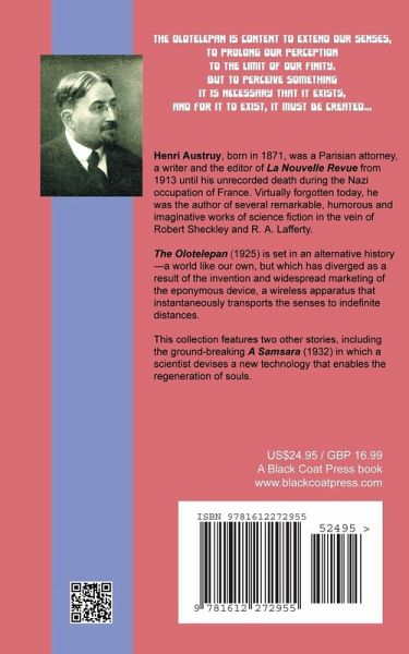 Henri Austry, born in 1871, was a Parisian attorney, a writer and the editor of La Nouvelle Revue from 1913 until his unrecorded death during the Nazi occupation of France. Virtually forgotten today, he was the author of several remarkable, humorous and imaginative works of science fiction in the vein of Robert Sheckley and R. A. Lafferty. His stories possess an idiosyncratic eccentricity that makes them highly unusual -- a quality worthy of interest and high praise in the field of imaginative literature. There is literally nothing else quite like them. The Olotelepan (1925) is set in an alternative history-a world like our own, but which has diverged as a result of the invention and widespread marketing of the eponymous device, a wireless apparatus that instantaneously transports the senses to indefinite distances. This collection features two other stories, including the ground-breaking A Samsara (1932) in which a scientist devises a new technology that enables the regeneration of souls.