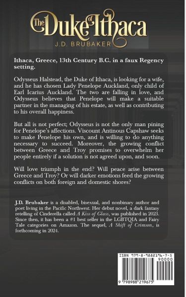 Ithaca, Greece, 13th Century B.C. in a faux Regency setting. Odysseus Halstead, the Duke of Ithaca, is looking for a wife, and he has chosen Lady Penelope Auckland, only child of Earl Icarius Auckland. The two are very much falling in love, and Odysseus believes that Penelope will make a suitable partner in the managing of his estate, as well as contributing to his overall happiness. But all is not perfect; Odysseus is not the only man pining for Penelope's affections. Viscount Antinous Capshaw seeks to make Penelope his own, and is willing to do anything necessary to succeed. Moreover, the growing conflict between Greece and Troy promises to overwhelm her people entirely if a solution is not agreed upon, and soon. Will love triumph in the end? Will peace arise between Greece and Troy? Or will darker emotions feed the growing conflicts on both foreign and domestic shores? Read The Duke of Ithaca to find out!