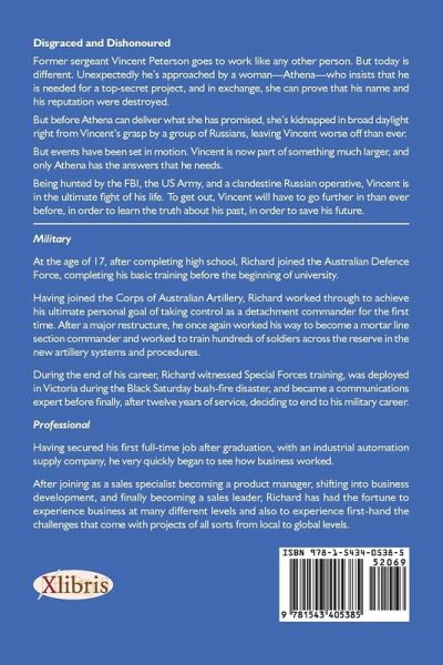 Former sergeant Vincent Peterson goes to work like any other person. But today is different. Unexpectedly, he?s approached by a woman?Athena?who insists that he is needed for a top-secret project, and in exchange, she can prove that his name and his reputation were destroyed. But before Athena can deliver what she has promised, she?s kidnapped in broad daylight right from Vincent?s grasp by a group of Russians, leaving Vincent worse off than ever. Events have been set in motion. Vincent is now part of something much larger, and only Athena has the answers that he needs. Being hunted by the FBI, the US Army, and a clandestine Russian operative, Vincent is in the ultimate fight of his life. To get out, Vincent will have to go further in than ever before in order to learn the truth about his past and save his future.