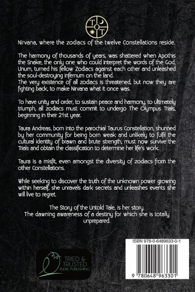 Taura Andreas, misfit amongst the diversity of zodiacs from all Constellations, shunned by her community, must undergo the Olympus Trials. The Story of the Untold Tale, tells of the dawning awareness of a destiny for which she is totally unprepared.