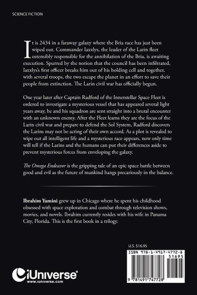 It is 2434 in a faraway galaxy where the Bria race has just been wiped out. Commander Iaxxlys, the leader of the Larin fleet ostensibly responsible for the annihilation of the Bria, is awaiting execution. Spurred by the notion that the council has been infiltrated, Iaxxlys's first officer breaks him out of his holding cell and together, with several troops, the two escape the planet in an effort to save their people from extinction. The Larin civil war has officially begun. One year later after Captain Radford of the Innerstellar Space Fleet is ordered to investigate a mysterious vessel that has appeared several light years away, he and his squadron are sent straight into a brutal encounter with an unknown enemy. After the Fleet learns they are the focus of the Larin civil war and prepare to defend the Sol System, Radford discovers the Larins may not be acting of their own accord. As a plot is revealed to wipe out all intelligent life and a mysterious race appears, now only time will tell if the Larins and the humans can put their differences aside to prevent mysterious forces from enveloping the galaxy. The Omega Endeavor is the gripping tale of an epic space battle between good and evil as the future of mankind hangs precariously in the balance.