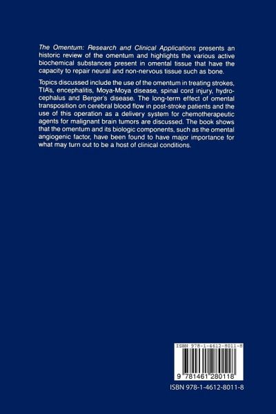 Arthur M. Vineberg MD 1903-1988: A pioneer in the use of the omentum.- Historical images and ideas about the greater omentum.- Anatomy of the greater and lesser omentum in the mouse with some physiological implications.- Angiogenesis and the greater omentum.- Can transected spinal cord axons be bribed into regeneration?.- Vasoactive neurochemicals in the omentum: Implications for CNS injury.- Experimental studies of omentum-derived neurotrophic factors.- Time and dose-dependent profile of omental angiogenic lipid factor on bone repair.- An rCBF follow-up study in stroke patients after omentum transposition to the brain.- Omental transposition to bypass the blood brain barrier for delivery of chemotherapeutic agents to malignant brain tumours: preclinical investigation.- The omentum: Present status and future application.- Omental transposition to the brain: Experimental and human applications.- Cerebral revascularization by omental graft for moyamoya disease.- Omental transposition for treating the sequelae of viral encephalitis: A surgical and follow-up study of 32 cases.- Experimental and clinical use of omental transposition for spinal cord pathology.- Omental transplantation for Buerger's disease.- Lumbo-omental shunt for treatment of communicating hydrocephalus.- The anaesthetic management of patients undergoing omental transposition to the central nervous system.- Summation: Ideas presented and lessons learned. The omentum: A physiological generating system of basic physiology. The need for its application to myocardial vascularization and other clinical problems.- Perspectives in scientific research: A speech to participants at the 1st International Conference on the Omentum.