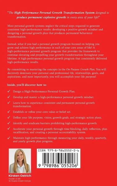 Most personal growth systems need to pay more attention to the critical steps required to generate consistent high-performance results: developing a positive growth mindset and designing a personal growth plan that produces permanent behavioral transformation. Instead, what if you had a personal growth program focused on helping you grow and achieve high performance in each of your core areas of life? A high-performance personal growth program that provides the framework to continue elevating and propelling your growth transformation throughout your lifetime. A high-performance personal growth program that consistently delivered high-performance results. By committing to mastering the concepts in the On Purpose Growth Plan, You will decisively dominate your personal and professional life, relationships, goals, and aspirations, and most importantly, you will accomplish your life purpose! Reader Feedback: "If you are serious about making substantial improvements in your personal and professional life, this is a book you'll want to read and re-read. It is filled to overflowing with wisdom and insights which will help you overcome the challenges you face, and to reach the full potential that lies within you. This is not a book that you will casually read in search of a couple of pearls of wisdom. Rather it is a comprehensive, rigorous roadmap to transform yourself into a high performing over achiever. If you sincerely desire to reach the highest levels of success, I highly recommend that you read this book and apply the principles and strategies that are outlined within its pages." In this book, you will gain mastery of the following: -Key areas to consistently implementing your High-Performance Growth Plan -Understanding your current environmental baseline. -Acquiring and maintaining a positive mindset. -Acquiring clarity around your life vision and purpose. -Obtaining a relentless focus on your mindset and growth goals. -Overcoming complacency in your mind and body. -Leveraging your high-performance growth support system -Making the decision to act and practice a high-performance life. -Starting your high-performance growth transformation journey. -Designing a High-Performance Personal Growth Plan. -Developing and mastering a high-performance personal growth mindset. -Learning how to experience consistent and permanent personal growth transformation. -Establishing or restructuring your core emotional, relational, and physical/spatial environmental value or belief set. -Defining your life purpose, vision, growth goals, and strategic action plans. -Identifying and eradicating emotional, relational, and physical barriers prohibiting high-performance growth. -Accelerating your high-performance personal growth through time blocking, daily reflection, plan recalibration and establishing a high-performance personal accountability system. -Maintaining your high performance through measuring your daily, weekly, quarterly, and yearly growth plan progress. Plus, inside the book, you get download links for over 55 Free!! downloadable tools and resources. Even if you only applied one of the principles covered in this book, it would easily cover the cost of this book 100x over. ¿Click "Buy Now" and grab your copy today!
