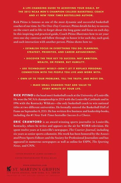 A life-changing guide to achieving your goals, by the 2013 NCAA champion college basketball coach and #1 New York Times bestselling author. Rick Pitino is famous as one of the most dynamic and successful basketball coaches of our time, leading the University of Louisville Cardinals to the NCAA basketball championship in 2013, and is renowned for writing the #1 New York Times bestselling success and leadership book, Success is a Choice . In his new book, The One-Day Contract, Pitino details his key to success, on the court and in life: to focus on making the most of each day, by creating a contract with yourself. Coach Pitino was able to turn Louisville into NCAA champions by applying this idea to everything he and the team did-every practice, every recruiting visit, every game preparation, every scouting report, every instruction that he gave players and coaches, and everything he did himself. Each day became just as important as reaching the national championship, and so, by honoring the one-day contract, he and Louisville moved through adversity toward their goal. In this inspiring and practical guide, Coach Rick Pitino illustrates how to set your own one-day contract, and follow through to honor it for each day, each goal, and each interaction with another person. Pitino shows how to: - Establish focus as a discipline in everything you do: planning, strategy, priorities, and career advancement. - Discover the true key to success: not ambition, not wealth, not power, but humility. - Use technology wisely-but don't let it replace personal connection with the people you work and live with. - Own up to your problems, tell the truth and they will become part of your past. Lie and they become part of your future. - Make small changes and add value to every minute of your life. The One-Day Contract will reshape the way you approach your job, your goals, and your life.