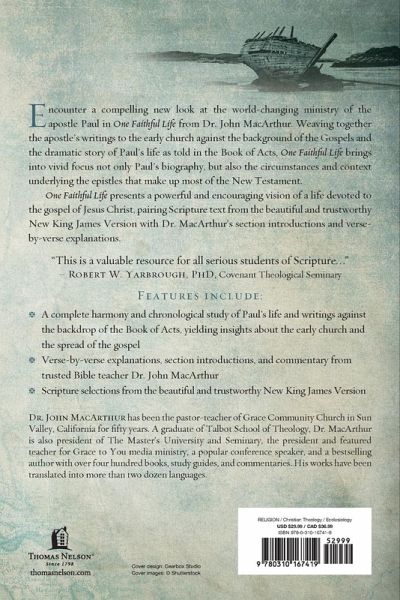 Experience Paul's world-changing writings in the full, chronological context of his life story--from Pharisee and persecutor of the church to the most influential defender of the gospel of Jesus Christ. "Paul, a servant of Jesus Christ..." So goes Paul's typical introduction, a modest title for one of Christianity's most authoritative figures. Unique among the apostles, Paul was well-educated and well-respected in the Jewish community of the day. His story is one of dramatic conversion and passionate instruction. His life's work was becoming a servant of Jesus Christ. From pastor and teacher Dr. John MacArthur, One Faithful Life is the first-of-its-kind harmony of Paul's message and life. As with One Perfect Life--which weaved the Gospels into the seamless narrative of Jesus' life--One Faithful Life walks us chronologically through the biblical ministry of Paul, tying together background information from the Gospels, the book of Acts, and Paul's epistles to the growing movement of Christ-followers. In this comprehensive storyline of the Apostle Paul's life, you'll find: Verse-by-verse explanations and section introductions from one of the most respected pastor-teachers of our time Introductory commentary of the major themes and purpose of each of Paul's letters A fresh perspective on the enduring truths of the gospel message