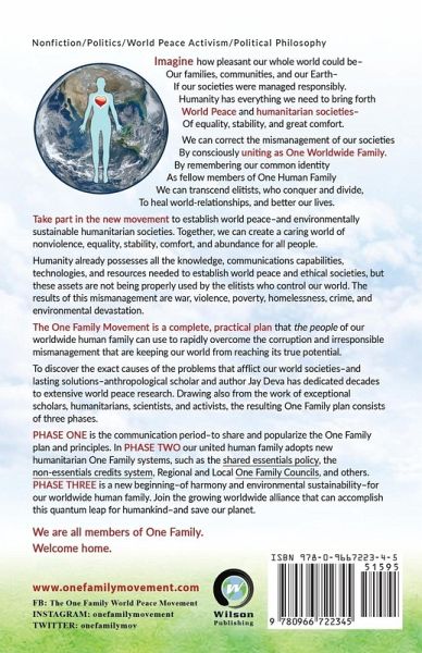 IMAGINE how pleasant our whole world could be− Our families, communities, and our Earth− If our societies were managed responsibly. Humanity has everything we need to bring forth World Peace and humanitarian societies− Of equality, stability, and great comfort. We can correct the mismanagement of our societies By consciously uniting as One Worldwide Family. By remembering our common identity As fellow members of One Human Family We can transcend elitists, who conquer and divide, To heal world-relationships, and better our lives. Take part in the new movement to establish world peace−and environmentally sustainable humanitarian societies. Together, using modern communications, humanity can cooperatively create a caring world of nonviolence, equality, stability, comfort, and abundance for all people. Humanity already possesses all the knowledge, communications capabilities, technologies, and resources needed to establish world peace and ethical, abundant societies. But these assets are not being properly used by elitists who control our world. The results of this mismanagement are war, violence, poverty, homelessness, crime, and environmental devastation. The One Family Movement is a complete, practical plan that the people of our worldwide human family can use to rapidly overcome the corruption and irresponsible mismanagement that are keeping our world from reaching its true potential. To discover the exact causes of the problems that afflict our world societies−and lasting solutions−anthropological scholar and author Jay Deva has dedicated decades to extensive world peace research. Drawing also from the work of exceptional scholars, humanitarians, scientists, and activists, the resulting One Family plan consists of three phases. PHASE ONE: is the communication period−to share and popularize the One Family plan and principles. PHASE TWO: To transcend corrupt and misguided elitist governments, the people of our united human family cooperatively create and adopt new humanitarian One Family systems, such as the shared essentials policy, the non-essentials credits system, Regional and Local One Family Councils, and others. PHASE THREE is a new beginning−of harmony and environmental sustainability−for our worldwide human family. Join the growing worldwide alliance that can accomplish this quantum leap for humankind−and save our planet. We are all members of One Family. Welcome home. www.onefamilymovement.com
