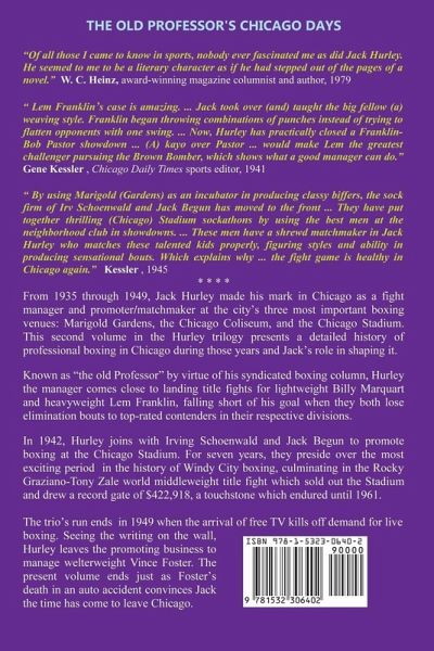 The One Is Jack Hurley is an epic three-volume bio-history of boxing’s Golden Age beginning with Jack Dempsey in the 1910s and ending with the emergence of George Foreman in 1970, as filtered through the life experience of legendary manager and promoter "Deacon" Jack Hurley. Hurley began his career in Fargo, North Dakota, just before World War I, worked in and around New York and Chicago from the mid 1920s through the ‘40s, and settled in Seattle in 1950. Hurley’s life, more than any other, personifies pro boxing’s journey out of the backrooms and bars of the 1900s, to the arenas and stadiums of the 1920s, ‘30s, and ‘40s, and into the parlors and family TV rooms of the 1950s and ‘60s. It is a history not only of one man’s life, but of the sport itself. A tale long neglected only because Jack’s career was so long and multifaceted. Volume 2, The Old Professor’s Chicago Days, catalogs Hurley’s middle years when he faced the challenge of rebuilding his career after the retirement of Billy Petrolle, his No. 1 fighter and meal ticket. From 1935 through 1949, Jack made a lasting mark in Chicago as a fight manager and promoter/matchmaker at the city’s three most important boxing venues: Marigold Gardens, the Chicago Coliseum, and the Chicago Stadium. This volume in the Hurley trilogy presents a detailed history of professional boxing in Chicago during those years and Jack’s role in shaping it. Known as "the old Professor" by virtue of his syndicated boxing column, Hurley the manager comes close to landing title fights for lightweight Billy Marquart in 1939 and heavyweight Lem Franklin in 1942, only to fall short of these goals when both fighters lose elimination bouts to top-rated contenders in their respective divisions. In the latter part of 1942, Hurley joins with Irving Schoenwald and Jack Begun to promote boxing at the Chicago Stadium, then the nation’s largest indoor arena. For seven years, they preside over the most exciting period in the history of Windy City boxing, culminating in the Rocky Graziano-Tony Zale world middleweight title fight which grossed $422,918, an indoor record that endured until 1961. The trio’s run ends in 1949 when the arrival of free TV kills off demand for live boxing. Seeing the writing on the wall, Hurley leaves the promoting business to manage welterweight Vince Foster. The present volume ends just as Foster’s death in an auto accident convinces Jack the time has come to leave Chicago.