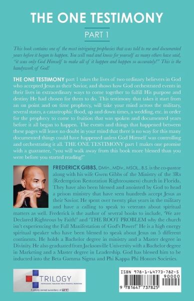 This book contains one of the most intriguing prophecies that was told to me and documented years before it began to happen. You will read and know for yourself as many others have said, "it was only God Himself to make all of it happen and happen so accurately!" This is the handywork of God! THE ONE TESTIMONY part 1 takes the lives of two ordinary believers in God who accepted Jesus as their Savior, and shows how God orchestrated events in their lives in extraordinary ways to come together to fulfill His purpose and destiny He had chosen for them to do. This testimony that takes it start from an on point and on time prophecy, will take your mind across the military, several states, a catastrophic flood, up and down times, a wedding, etc. in order for the prophecy to come to fruition that was spoken and documented years before it all began to happen. The events and things that happened between these pages will leave no doubt in your mind that there is no way for this many documented things could have happened unless God Himself was controlling and orchestrating it all. THE ONE TESTIMONY part 1 makes one promise with a guarantee, "you will walk away from this book more blessed than you were before you started reading!"