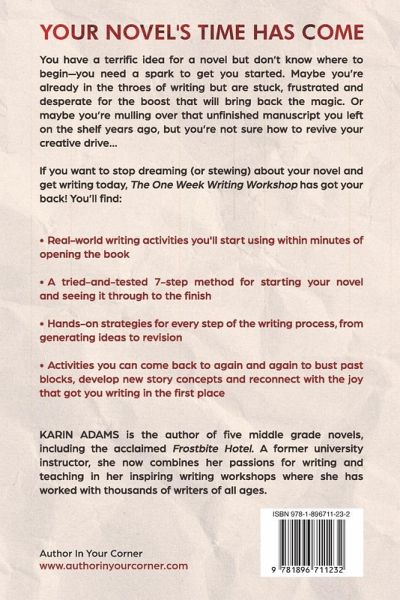 It's time to crush the blank page, shed your writer's angst and write the novel you were meant to write! All the magic and enthusiasm of acclaimed author Karin Adams' in-person writing workshops-now in book form! You've always wanted to write a novel and have been nurturing a great idea. Perhaps you've made a pile of notes-even written several chapters. But as you sit down alone with the blank page or your next scene, nothing happens. Or if the writing does start to flow, it soon dries up. You're facing that overwhelming gap between the story you're imagining and the book you want to write. It's enough to cause most people to throw in the towel. But that doesn't have to be you! In The One Week Writing Workshop, author Karin Adams helps you to overcome the overwhelm. She breaks the writing process down into a series of bite-sized, actionable tasks within a proven seven-step method. It's the method Karin herself uses, and the one she has taught to thousands of workshop participants since 2010. This book is for you whether you're just starting your novel, stuck in the middle, or getting back to an old draft. While The One Week Writing Workshop emphasizes taking action now, it also circles back to story essentials as you go. If you've read other writing books, it will complement, reinforce and add fresh perspectives to what you've learned. If you've never studied creative writing before, The One Week Writing Workshop is the perfect book for getting yourself grounded while you get busy writing. Structured as a seven-day workshop, each chapter is a lively session guiding you through energizing tasks that get you working on and actively growing your story. Throughout the book, you have lots of choice so that you can further tailor the experience for you and your novel. You'll find: - 70+ real-world writing activities and strategies you'll start using within minutes of opening the book - A tried-and-tested 7-step method for starting your novel and seeing it through to the finish - Hands-on strategies for every step of the writing process, from generating ideas to revision - Helpful mini lessons to get (or keep) you grounded with story writing essentials - A blend of at-your-desk and out-of-the-box actions that help to inspire your entire creative self - Activities you can come back to again and again to bust past blocks, develop new story concepts and reconnect with the joy that got you writing in the first place The One Week Writing Workshop is the book you need when it's time to take action, write your novel and finally see it through to completion.