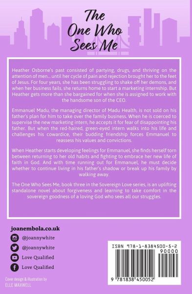 IS GOD SOVEREIGN OVER MISTAKES AND FAILURES? Heather Osborne's past consisted of partying, drugs, and thriving on the attention of men... until her cycle of pain and rejection brought her to the feet of Jesus. For four years, she has been struggling to shake off her demons, and when her business fails, she returns home to start a marketing internship. But Heather gets more than she bargained for when she is assigned to work with the handsome son of the CEO. Emmanuel Madu, the managing director of Madu Health, is not sold on his father's plan for him to take over the family business. When he is coerced to supervise the new marketing intern, he accepts it for fear of disappointing his father. But when the red-haired, green-eyed intern walks into his life and challenges his cowardice, their budding friendship forces Emmanuel to reassess his values and convictions. When Heather starts developing feelings for Emmanuel, she finds herself torn between returning to her old habits and fighting to embrace her new life of faith in God. And with time running out for Emmanuel, he must decide whether to continue living in his father's shadow or break up his family by walking away. The One Who Sees Me, book three in the Sovereign Love series, is an uplifting standalone novel about forgiveness and learning to take comfort in the sovereign goodness of a loving God who sees all our struggles.