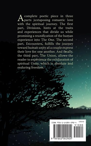 A complete poetic piece in three parts juxtaposing romantic love with the spiritual journey.The first part, Divisions, hints at the traits and experiences that divide us while promising a reunification of the human experience into The One. The second part, Encounters, fulfills the journey toward human unity as a couple express their love for one another. And finally, the third part, The Union, allows the reader to experience the exhilaration of spiritual Unity, which is absolute and enduring freedom.