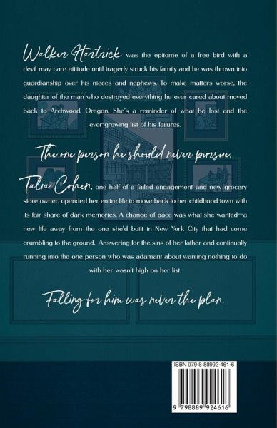 Walker Hartrick was the epitome of a free bird with a devil-may-care attitude until tragedy struck his family and he was thrown into guardianship over his nieces and nephews. To make matters worse, the daughter of the man who destroyed everything he ever cared about moved back to Archwood, Oregon. She's a reminder of what he lost and the ever-growing list of his failures. The one person he should never pursue. Talia Cohen, one half of a failed engagement and new grocery store owner, upended her entire life to move back to her childhood town with its fair share of dark memories. A change of pace was what she wanted-a new life away from the one she'd built in New York City that had come crumbling to the ground. Answering for the sins of her father and continually running into the one person who was adamant about wanting nothing to do with her wasn't high on her list. Falling for him was never the plan.