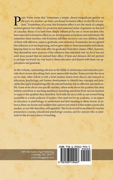 A volume in Adolescence and Education Series Editors Tim Urdan, Santa Clara University and Frank Pajares Emory University Paulo Freire wrote that "sometimes a simple, almost insignificant gesture on the part of a teacher can have a profound formative effect on the life of a student." Sometimes, of course, this formative effect is not the result of a simple, isolated gesture but rather of a proactive and sustained series of gestures on the part of a teacher. Many of us have been deeply influenced by one or more teachers who have exercised a formative effect in our development as students and individuals. We remember these teachers with fondness, tell their stories to our own children, think of them with affection, respect, gratitude, even reverence. Sometimes, we recognized this influence as it was happening, and we grew close to these remarkable individuals, keeping them in our lives even after we graduated from their classes. Often, however, they themselves were unaware of the influence they exercised over us, for it was not until years passed that we realized their effect. If time and distance did not prevent it, perhaps we found our way back to these educators and shared with them our appreciation and gratitude. In this volume, outstanding scholars in the fields of adolescence and education provide short stories describing their most memorable teacher. Some provide the story on its own; other follow it with a brief analysis drawn from theory and research in education, psychology, and human development to identify key concepts and principles that apply in explaining why the selected teacher was so effective and memorable. Some write about one specific teacher; others write about the qualities that they believe contribute to teaching excellence, including anecdotes from various teachers to support the qualities they identified. Each tells the story with an eye toward being accessible to a wide audience of readers. One need not be an academic, or an expert in education or psychology, to understand and find meaning in these stories. In essence, these are stories and analyses that capture just what it is that makes a particular teacher, as our title describes, unforgettable. This book would be excellent for teacher preparation courses, educational psychology courses, and for anyone who is interested in the art and science of teaching.