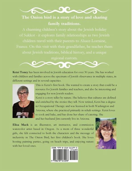 The Onion Bird is a charming children's story about the Jewish holiday of Sukkot. It explores family relationships as two Jewish children travel with their parents to Alsace Lorraine, France. On this visit with grandfather, their Zayde teaches about Jewish traditions, biblical history, and a unique regional custom, while imparting Jewish values. In this story Sam and Sarah, the main characters, are recalling spending quality time hiking in the woods, collecting treasures, and learning from their Zayde. The Onion Bird touches on how building special memories connect us over time and space. The Onion bird is a story of love and sharing family traditions.