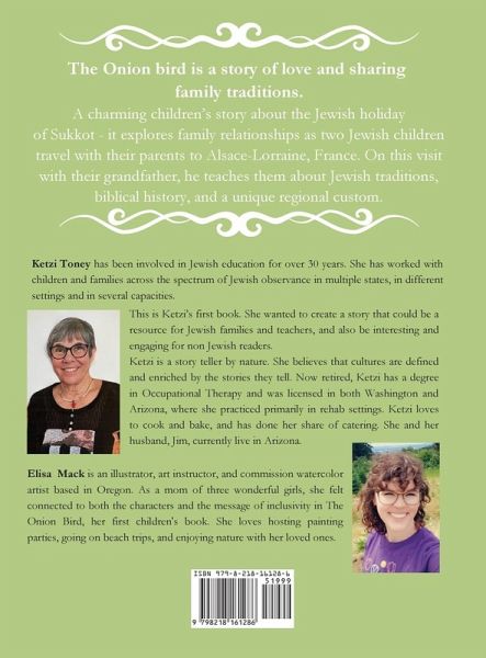 The Onion Bird is a charming children's story about the Jewish holiday of Sukkot. It explores family relationships as two Jewish children travel with their parents to Alsace Lorraine, France. On this visit with grandfather, their Zayde teaches about Jewish traditions, biblical history, and a unique regional custom, while imparting Jewish values. In this story Sam and Sarah, the main characters, are recalling spending quality time hiking in the woods, collecting treasures, and learning from their Zayde. The Onion Bird touches on how building special memories connect us over time and space. The Onion bird is a story of love and sharing family traditions.
