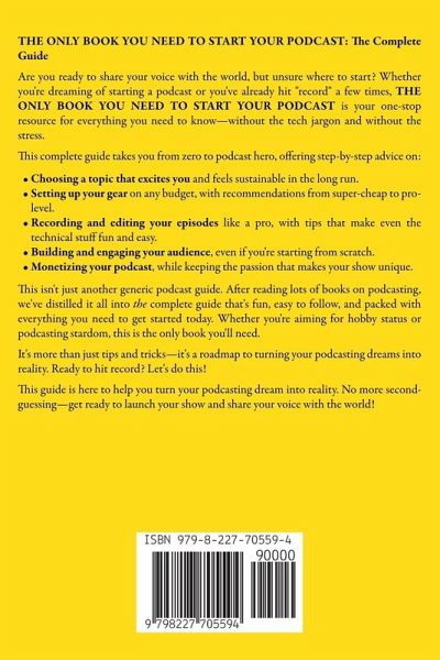 THE ONLY BOOK YOU NEED TO START YOUR PODCAST: The Complete Guide Are you ready to share your voice with the world, but unsure where to start? Whether you're dreaming of starting a podcast or you've already hit "record" a few times, THE ONLY BOOK YOU NEED TO START YOUR PODCAST is your one-stop resource for everything you need to know-without the tech jargon and without the stress. This complete guide takes you from zero to podcast hero, offering step-by-step advice on:Choosing a topic that excites you and feels sustainable in the long run. Setting up your gear on any budget, with recommendations from super-cheap to pro-level. Recording and editing your episodes like a pro, with tips that make even the technical stuff fun and easy. Building and engaging your audience, even if you're starting from scratch. Monetizing your podcast, while keeping the passion that makes your show unique. This isn't just another generic podcast guide. After reading lots of books on podcasting, we've distilled it all into the complete guide that's fun, easy to follow, and packed with everything you need to get started today. Whether you're aiming for hobby status or podcasting stardom, this is the only book you'll need. It's more than just tips and tricks-it's a roadmap to turning your podcasting dreams into reality. Ready to hit record? Let's do this! This guide is here to help you turn your podcasting dream into reality. No more second-guessing-get ready to launch your show and share your voice with the world!