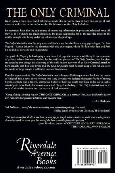 Once upon a time, in a world otherwise much like our own, there is only one source of evil, torment and crime in the entire world. He is known as The Only Criminal. By extension, he is also the only source of interesting information in print and televisual news. All movies, all TV shows, are made about him. He is also responsible for all the recorded music in the world, brought into being under the influence of illegal drugs. The Only Criminal is also the only source of fascination for a brilliant young psychologist, Dr. Paul Vaguely - a man driven by his obsession with this one subject, which fills him with fear and fuels his boundless curiosity and imagination. The good Dr. Vaguely is developing a new branch of psychiatric care, specializing in the treatment of patients whose lives were touched by the peril and plunder of The Only Criminal, but his plans are upset by two things: the discovery of the only known survivor of an Only Criminal attack to have actually seen him and lived; and The Only Criminal's most fiendish coup of all, which steers the world at large toward a collective nervous breakdown. Decades in preparation, The Only Criminal is many things: a Kafkaesque comic book on the theme of Original Sin; a never-more-relevant love story between two isolated characters fearful of risking human contact; even a fanciful alternative history of how our world may have ended up in such a catastrophic mess. Dark, humorous, erotic and charged with danger, The Only Criminal may be its author's definitive journey into the depths of dark obsession. "Compulsively, enviably superb. THE ONLY CRIMINAL is a marvel! Tim Lucas brilliantly weaves wit, romance and glorious wisdoms with maestro cool." - R.C. Matheson (Dystopia) "It's brilliant... one of the most interesting and entertaining things I've read! - Kelley Jones, (Batman, The Sandman) "This is a wonderful, droll, witty book-a real joy for people with eclectic cinematic and reading tastes. A bedtime book to savor, just like one of the hero's vanilla-flavored cigarettes." - Joan Hawkins (Cutting Edge: Art Horror & the Horrific Avant-Garde)