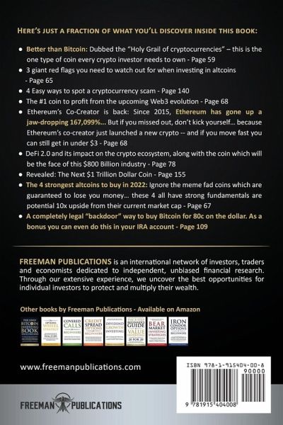 If you feel like you've "missed the boat" on Crypto. Think again... Because while the crypto market increased 10x in the past year alone, this book will show you it's not too late to invest in the #1 asset of the 2020s What was once a fringe currency only used by a dark corner of the web... is now the fastest growing financial asset on Earth. And this is just the beginning... You see, we are still in just the 3nd inning of Crypto as a financial entity. So while no financial vehicle is making people rich as quickly as Cryptocurrency... Less than 8% of Americans and 3% of the worldwide population owns it! But now, the major players are taking an interest. Like the world's #1 venture capital firm Andreesen Horowitz who just announced the largest crypto fund of all time. Or BlackRock, the world's largest asset manager (with over $9.5 Trillion of Assets) who just invested over $40 Billion in the crypto markets And CEO of Social Capital, Chamath Palihapitiya, who predicts Bitcoin will be worth $1 million within the next 15 years. So even if you've been unconvinced thus far, this book will give you the straight facts on Crypto as a financial asset... without any of the hype or noise. Here's just a fraction of what you'll discover inside this bookBetter than Bitcoin: Dubbed the "Holy Grail of cryptocurrencies" - this is the one type of coin every crypto investor needs to own 3 giant red flags you need to watch out for when investing in altcoins The #1 coin to profit from the upcoming Web3 evolution 4 Easy ways to spot a cryptocurrency scam Ethereum's Co-Creator is back: Since 2015, Ethereum has gone up a jaw-dropping 167,099%... But if you missed out, don't kick yourself... because Ethereum's co-creator just launched a new crypto -- and if you move fast you can still get in under $3. DeFi 2.0 and its impact on the crypto ecosystem, along with the coin which will be the face of this $800 Billion industry Revealed: The Next $1 Trillion Dollar Coin The 4 strongest altcoins to buy in 2022: Ignore the meme fad coins which are guaranteed to lose you money... these 4 all have strong fundamentals are potential 10x upside from their current market cap A completely legal "backdoor" way to buy Bitcoin for 80c on the dollar. As a bonus you can even do this in your IRA account This is not a 600 page theoretical book which you need a math degree to understand. Written in plain English and free from repetitive technical jargon. Every single piece of financial and technical terminology is clearly defined inside. You'll find easy-to-follow advice in how to buy and store coins yourself... without having to pay expensive fees to middlemen. For everyone who feels frustrated after watching Bitcoin and other cryptos soar in price... This is your chance to get in while the going is good... and not feel like you missed out! So even if you're never read a single finance or investing book in your life, you will immediately understand how to become a successful long-term investor. To kickstart your Crypto investing journey today, scroll up and click "add to cart"