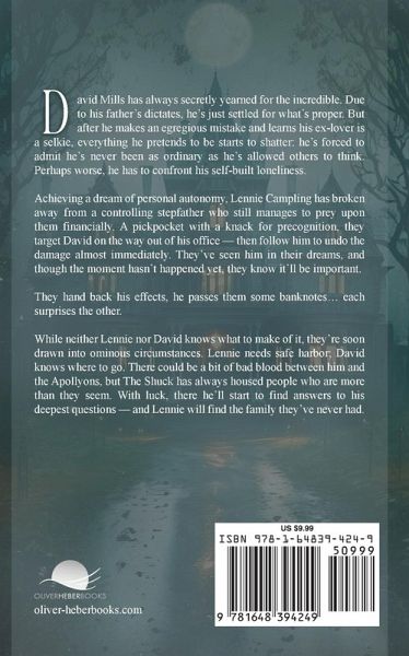 David Mills has always secretly yearned for the incredible. Due to his father's dictates, he's just settled for what's proper. But after he makes an egregious mistake and learns his ex-lover is a selkie, everything he pretends to be starts to shatter: he's forced to admit he's never been as ordinary as he's allowed others to think. Perhaps worse, he has to confront his self-built loneliness. Achieving a dream of personal autonomy, Lennie Campling has broken away from a controlling stepfather who still manages to prey upon them financially. A pickpocket with a knack for precognition, they target David on the way out of his office - then follow him to undo the damage almost immediately. They've seen him in their dreams, and though the moment hasn't happened yet, they know it'll be important. They hand back his effects, he passes them some banknotes... each surprises the other. While neither Lennie nor David knows what to make of it, they're soon drawn into ominous circumstances. Lennie needs safe harbor; David knows where to go. There could be a bit of bad blood between him and the Apollyons, but The Shuck has always housed people who are more than they seem. With luck, there he'll start to find answers to his deepest questions - and Lennie will find the family they've never had.