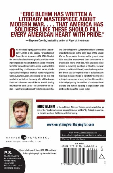 "The Only Thing Worth Dying For" is not only brilliant, it's the one book you must read if you have any hope of understanding what our fine American soldiers are up against in Afghanistan.--former Congressman Charlie Wilson.