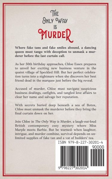 Where fake tans, fake smiles, and one real murder collide, a dancing queen must unmask a killer before the final curtain falls. As her 50th birthday approaches, Chloe Essex is ready to unveil her exciting new business venture in the quaint English village of Speckled Hill. But her perfect celebration takes a deadly turn when she discovers her best friend dead in the marquee just days before the big reveal. Accused of murder and up to her neck in shady business dealings, tangled love affairs, and half the county's nosiest gossips, she's fighting to clear her name and salvage her reputation. With secrets buried deep beneath a sea of Botox, Chloe must unmask the killer fast, because this isn't just a whodunnit. It's personal. And if she doesn't crack the case, she might be next. The Only Way is Murder is book one of the Chloe Essex Cozy Mysteries, a warm and witty British series where Midsomer Murders meets Bridget Jones, with an ever-so-slightly bonkers twist. Best read in series order to avoid spoilers and missed clues, it's perfect for fans of The Thursday Murder Club, Agatha Raisin, and Stephanie Plum. But be warned: when laughter, intrigue, and murder combine, survival depends on unlimited supplies of fake tan and a vat of builders' tea.