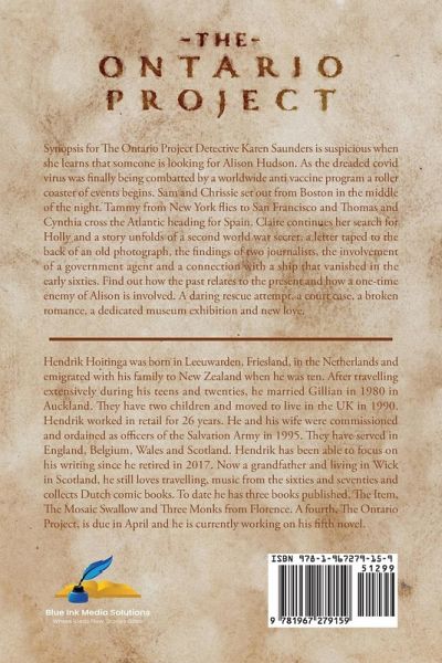 Synopsis for The Ontario Project Detective Karen Saunders is suspicious when she learns that someone is looking for Alison Hudson. As the dreaded covid virus was finally being combatted by a worldwide anti vaccine program a roller coaster of events begins. Sam and Chrissie set out from Boston in the middle of the night. Tammy from New York flies to San Francisco and Thomas and Cynthia cross the Atlantic heading for Spain. Claire continues her search for Holly and a story unfolds of a second world war secret, a letter taped to the back of an old photograph, the findings of two journalists, the involvement of a government agent and a connection with a ship that vanished in the early sixties. Find out how the past relates to the present and how a one-time enemy of Alison is involved. A daring rescue attempt, a court case, a broken romance, a dedicated museum exhibition and new love.