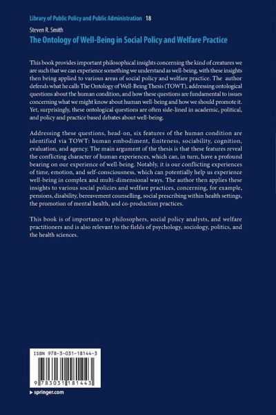 This book provides important philosophical insights concerning the kind of creatures we are such that we can experience something we understand as well-being, with these insights then being applied to various areas of social policy and welfare practice. The author defends what he calls The Ontology of Well-Being Thesis (TOWT), addressing ontological questions about the human condition, and how these questions are fundamental to issues concerning what we might know about human well-being and how we should promote it. Yet, surprisingly, these ontological questions are often side-lined in academic, political, and policy and practice based debates about well-being.