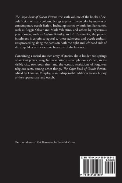 The Onyx Book of Occult Fiction, the sixth volume of the books of occult fiction of many colours, brings together fifteen tales by masters of contemporary occult fiction. Including stories by both familiar names, such as Reggie Oliver and Mark Valentine, and others by mysterious practitioners, such as Avalon Brantley and R. Ostermeier, the present instalment is certain to appeal to those adherents and occult enthusiasts proceeding along the paths on both the right and left hand side of the deep lakes of the esoteric literature of the fantastic. Containing a varied and rich array of stories, about hidden wellsprings of ancient power, vengeful incantations, a cacophonous séance, an invisible city, strenuous rites, and the ecstatic revelations of forgotten religious sects, among other things, The Onyx Book of Occult Fiction, edited by Damian Murphy, is an indispensable addition to any library of the supernatural and occult.