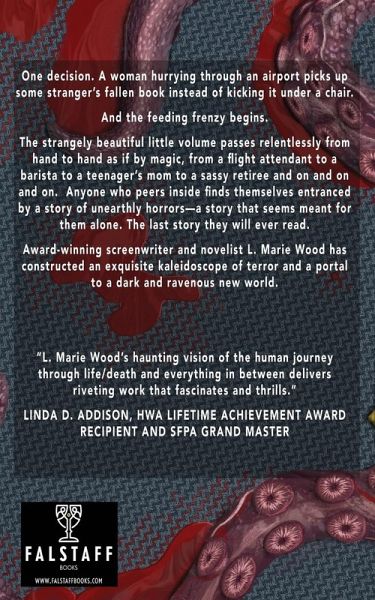 One decision. A woman hurrying through an airport picks up some stranger's fallen book instead of kicking it under a chair. And the feeding frenzy begins. The strangely beautiful little volume passes relentlessly from hand to hand as if by magic, from a flight attendant to a barrista to a teen-ager's mom to a sassy retiree and on and on and on. Anyone who peers inside finds themselves entranced by a story of unearthly horrors-a story that seems meant for them alone. The last story they will ever read. Award-winning screenwriter and novelist L. Marie Wood has constructed an exquisite kaleidoscope of terror and a portal to a dark and ravenous new world.
