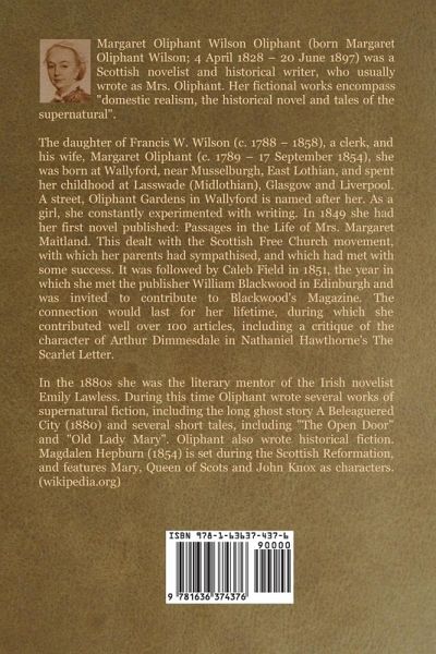 Margaret Oliphant Wilson Oliphant (born Margaret Oliphant Wilson; 4 April 1828 - 20 June 1897) was a Scottish novelist and historical writer, who usually wrote as Mrs. Oliphant. Her fictional works encompass "domestic realism, the historical novel and tales of the supernatural". The daughter of Francis W. Wilson (c. 1788 - 1858), a clerk, and his wife, Margaret Oliphant (c. 1789 - 17 September 1854), she was born at Wallyford, near Musselburgh, East Lothian, and spent her childhood at Lasswade (Midlothian), Glasgow and Liverpool. A street, Oliphant Gardens in Wallyford is named after her. As a girl, she constantly experimented with writing. In 1849 she had her first novel published: Passages in the Life of Mrs. Margaret Maitland. This dealt with the Scottish Free Church movement, with which her parents had sympathised, and which had met with some success. It was followed by Caleb Field in 1851, the year in which she met the publisher William Blackwood in Edinburgh and was invited to contribute to Blackwood's Magazine. The connection would last for her lifetime, during which she contributed well over 100 articles, including a critique of the character of Arthur Dimmesdale in Nathaniel Hawthorne's The Scarlet Letter. In the 1880s she was the literary mentor of the Irish novelist Emily Lawless. During this time Oliphant wrote several works of supernatural fiction, including the long ghost story A Beleaguered City (1880) and several short tales, including "The Open Door" and "Old Lady Mary". Oliphant also wrote historical fiction. Magdalen Hepburn (1854) is set during the Scottish Reformation, and features Mary, Queen of Scots and John Knox as characters. (wikipedia.org)
