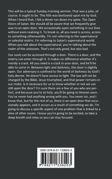 This will be a typical Sunday morning sermon. That was a joke, of course. It ought to be. This title was bestowed upon me by God. When I heard that, I felt a shiver run down my spine. The Open Doors of Satan. We should all be aware that we frequently give way to an open door. We occasionally open something in our lives without even realizing it. To break in, all you need is access, access to something otherworldly. I'm not referring to the supernatural or celestial realms. I'm referring to Satan's supernatural world. When you talk about the supernatural, you're talking about the realm of the unknown. That's not only good, but also bad. Our souls can be accessed through a door. There is a door, and the enemy can enter through it. It makes no difference whether it's merely a crack. All you need is a crack in your door, and he'll be able to come in. Between light and darkness, this door is slightly open. Our adversary is confined to the world of darkness by God's holy decree. He doesn't have access to light. The law will not be changed by the Bible. Jesus triumphed, and that power remains in our midst. Is it necessary for us to know whether or not we can still open the door? I'm sure there are a few of you who are perfect, and because you're so holy, you'll be going to Heaven soon. You've never had anything wrong with you. You never sin, and I know that, but for the rest of us, there is an open door that occasionally appears, and it occurs as a result of something we do. I'm going to discuss a specific aspect of one problem that is linked to a slew of other issues. I know you're going to be excited, so take a deep breath and relax so you can stay focused. We are free of these wicked forces, but if the door is left open, Satan and his henchmen get legal access. Their goal is to keep the places that open the door under control. Because all they need is access, and once they have access, they have legal rights. We have granted the adversary legal rights because we hav