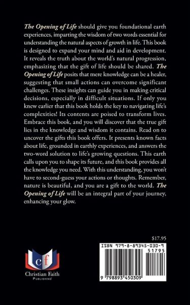 The Opening of Life should give you foundational earth experiences, imparting the wisdom of two words essential for understanding the natural aspects of growth in life. This book is designed to expand your mind and aid in development. It reveals the truth about the world's natural progression, emphasizing that the gift of life should be shared. The Opening of Life posits that mere knowledge can be a healer, suggesting that small actions can overcome significant challenges. These insights can guide you in making critical decisions, especially in difficult situations. If only you knew earlier that this book holds the key to navigating life's complexities! Its contents are poised to transform lives. Embrace this book, and you will discover that the true gift lies in the knowledge and wisdom it contains. Read on to uncover the gifts this book offers. It presents known facts about life, grounded in earthly experiences, and answers the two-word solution to life's growing questions. This earth calls upon you to shape its future, and this book provides all the knowledge you need. With this understanding, you won't have to second-guess your actions or thoughts. Remember, nature is beautiful, and you are a gift to the world. The Opening of Life will be an integral part of your journey, enhancing your glow.
