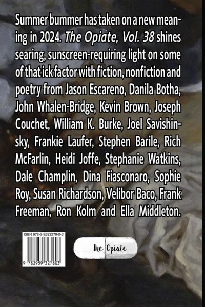 Summer bummer has taken on a new meaning in 2024. The Opiate, Vol. 38 shines searing, sunscreen-requiring light on some of that ick factor with fiction, nonfiction and poetry from Jason Escareno, Danila Botha, John Whalen-Bridge, Kevin Brown, Joseph Couchet, William K. Burke, Joel Savishinsky, Frankie Laufer, Stephen Barile, Rich McFarlin, Heidi Joffe, Stephanie Watkins, Dale Champlin, Dina Fiasconaro, Sophie Roy, Susan Richardson, Velibor Baco, Frank Freeman, Ron Kolm and Ella Middleton.