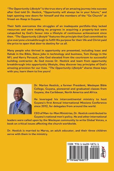 "The Opportunity Lifestyle" is the true story of an amazing journey into success after God told Dr. Hestick, "Opportunity will always be in your future," and kept opening new doors for himself and the members of the "Go Church" at Vreed-en-Hoop in Guyana. Their faith overcomes the struggles of an inadequate portfolio-they lacked resources and were making no progress in acquiring a property-but were catapulted by God's favour into a lifestyle of continuous achievement since then. "The Opportunity Lifestyle" features the principle that God committed to give everyone a breakthrough to fulfill His purpose for their life and Christ paid the price to open that door to destiny for us all. Many people who thrived in opportunity are presented, including Isaac and Rahab in the Bible, Steve Jobs in technology and business, Tom Dungy in the NFL and Harry Persaud, who God elevated from the courtroom to successful building contractor. As God moves Dr. Hestick and team from opportunity breakthrough into opportunity lifestyle, they discover key principles of God's amazing provision for our lives. "The Opportunity Lifestyle" shares those keys with you; learn them to live yours! Dr. Marlon Hestick, a former President, Wesleyan Bible College, Guyana, pioneered and graduated classes from Guyana, the Caribbean, North America and Africa. He leveraged his intercontinental ministry to host Guyana's first Annual International Missions Conference since 2012, for delegates from around the world. CEO of Man-to-Man Ministries, Dr. Hestick contributed to Guyana's national men's policy. He and other international leaders were called upon by the Wesleyan community to write Global Voices, a book on critical issues affecting the church worldwide. Dr. Hestick is married to Marva, an adult educator, and their three children serve with them in the ministry.