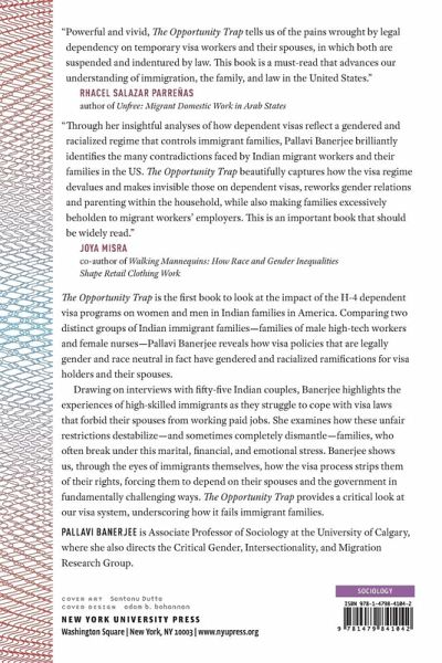 "This book explores how Indian immigrants grapple with experiences of being workers and being people as they migrate with their families to the U.S. for work. Drawing on extensive qualitative data from in-depth interviews, observations, and archival research, this is the first book to compare the work and family lives of two distinct groups of Indian immigrants--male high-tech workers and female nurses. Relocating with their spouses who arrive on H-4 dependent visas, the author unravels the dissonance between the state's perception of the migrant skilled worker and the immigrant subject's tribulations when negotiating the contradictory expectation of being ideal citizens/ workers/families without having the security of permanence in the U.S. The author also shows how restricting the spouses of temporary workers, who are on dependent visas in the U.S., from working for pay, constrain and fracture individuals and their families leaving many to refer to the dependent visas as "vegetable visas" and "prison visas." This book reveals how visas policies strip women and men of basic rights within the home, at the workplace, and in civil society by creating gendered and racialized structures of dependence comprising the state, work organizations, transnational global processes, and migrant workers and their families. Visa policies that are legally gender and race neutral, in fact, have gendered and racialized ramifications for visa holders and their spouses. Those whose worlds are tied to these visas struggle to negotiate their lives as they are legally governed by what Banerjee calls a visa regime embedded in a gendered and racialized system of oppression."--