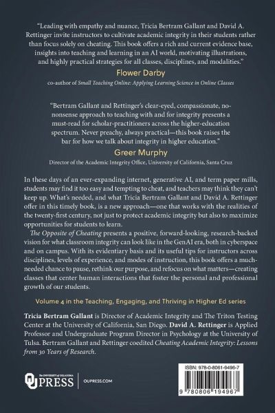 In these days of an ever-expanding internet, generative AI, and term paper mills, students may find it too easy and tempting not to cheat, and teachers may think they can't keep up. What's needed, and what Tricia Bertram Gallant and David Rettinger offer in this timely book, is a new approach-one that works with the realities of the twenty-first century, not just to protect academic integrity but also to maximize opportunities for students to learn. The Opposite of Cheating presents a positive, forward-looking, research-backed vision for what classroom integrity can look like in the GenAI era, both in cyberspace and on campus. Accordingly, the book outlines workable measures teachers can use to better understand why students cheat and to prevent cheating while aiming to enhance learning and integrity. Bertram Gallant and Rettinger provide practical suggestions to help faculty revise the conversation around integrity, refocus classes and students on learning, reconsider the structure and goals of assessment, and generally reframe our response to cheating. At the core of this strategy is a call for teachers, academic staff, institutional leaders, and administrators to rethink how we "show up" for students, and to reinforce and fully support quality teaching, learning, and assessment. With its evidentiary basis and its useful tips for instructors across disciplines, levels of experience, and modes of instruction, this book offers a much-needed chance to pause, rethink our purpose, and refocus on what matters-creating classes that center human interactions that foster the personal and professional growth of our students.