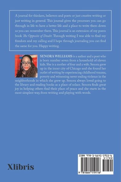 A journal for thinkers, believers and poets or just creative writing or just writing in general. This journal gives the processes you can go through in life to have a better life and a place to write them down so you can remember them. This journal is an extension of my poem book The Opposite of Doubt. Through writing I was able to find my freedom and my calling and I hope through journaling you can find the same for you. Happy writing.