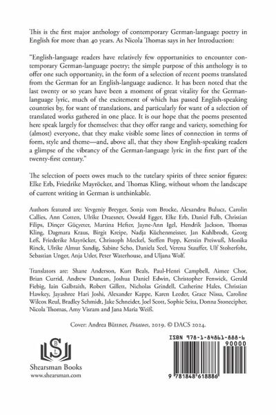 This is the first major anthology of contemporary German-language poetry in English for more than 40 years. As Nicola Thomas says in her Introduction:"English-language readers have relatively few opportunities to encounter contemporary German-language poetry; the simple purpose of this anthology is to offer one such opportunity, in the form of a selection of recent poems translated from the German for an English-language audience. It has been noted that the last twenty or so years have been a moment of great vitality for the German-language lyric, much of the excitement of which has passed English-speaking countries by, for want of translations, and particularly for want of a selection of translated works gathered in one place. It is our hope that the poems presented here speak largely for themselves: that they offer range and variety, something for (almost) everyone, that they make visible some lines of connection in terms of form, style and theme-and, above all, that they show English-speaking readers a glimpse of the vibrancy of the German-language lyric in the first part of the twenty-first century." The selection of poets owes much to the tutelary spirits of three senior figures: Elke Erb, Friedrike Mayroecker, and Thomas Kling, without whom the landscape of current writing in German is unthinkable.Authors featured are Yevgeniy Breyger, Sonja vom Brocke, Alexandru Bulucz, Carolin Callies, Ann Cotten, Ulrike Draesner, Oswald Egger, Elke Erb, Daniel Falb, Christian Filips, Dinçer Güçyeter, Martina Hefter, Jayne-Ann Igel, Hendrik Jackson, Thomas Kling, Dagmara Kraus, Birgit Kreipe, Nadja Küchenmeister, Jan Kuhlbrodt, Georg Less, Friederike Mayroecker, Christoph Meckel, Steffen Popp, Kerstin Preiwuss, Monika Rinck, Ulrike Almut Sandig, Sabine Scho, Daniela Seel, Verena Stauffer, Ulf Stolterfoht, Sebastian Unger, Anja Utler, Peter Waterhouse, and Uljana Wolf.Translators are Shane Anderson, Kurt Beals, Paul-Henri Campbell, Aimee Chor, Brian Currid, Andrew Duncan, Joshua Daniel Edwin, Christopher Fenwick, Gerald Fiebig, Iain Galbraith, Robert Gillett, Nicholas Grindell, Catherine Hales, Christian Hawkey, Jayashree Hari Joshi, Alexander Kappe, Karen Leeder, Grace Nissan, Caroline Reul, Bradley Schmidt, Jake Schneider, Joel Scott, Sophie Seita, Donna Stonecipher, Nicola Thomas, Amy Visram and Jana Maria Weiss.