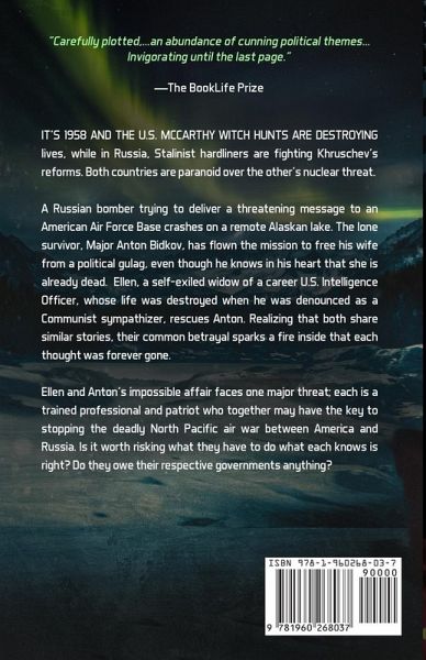 IT'S 1958 AND THE U.S. MCCARTHY WITCH HUNTS ARE DESTROYING lives, while in Russia, Stalinist hardliners are fighting Khrushchev's reforms. Both countries are paranoid over the other's nuclear threat. A Russian bomber trying to deliver a threatening message to an American Air Force Base crashes on a remote Alaskan lake. The lone survivor, Major Anton Bidkov, has flown the mission to free his wife from a political gulag, even though he knows in his heart that she is already dead. Ellen, a self-exiled widow of a career U.S. intelligence officer, whose life was destroyed when he was denounced as a Communist sympathizer, rescues Anton. Realizing that both share similar stories, their common betrayal sparks a fire inside that each thought was forever gone. Ellen and Anton's impossible affair faces one major threat; each is a trained professional and patriot who together may have the key to stopping the deadly North Pacific air war between America and Russia. Is it worth risking what they have, to do what each knows is right? Do they owe their respective governments anything?