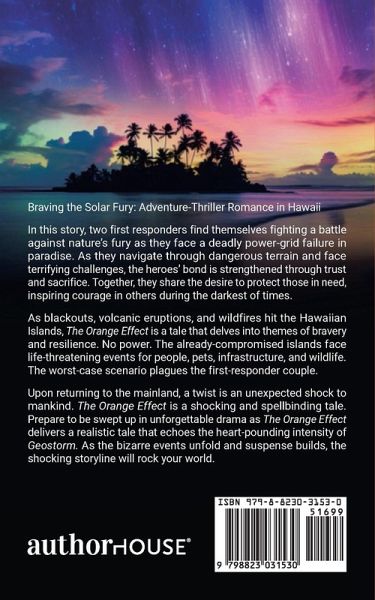 Braving the Solar Fury: Adventure-Thriller Romance in Hawaii In this story, two first responders find themselves fighting a battle against nature's fury as they face a deadly power-grid failure in paradise. As they navigate through dangerous terrain and face terrifying challenges, the heroes' bond is strengthened through trust and sacrifice. Together, they share the desire to protect those in need, inspiring courage in others during the darkest of times. As blackouts, volcanic eruptions, and wildfires hit the Hawaiian Islands, The Orange Effect is a tale that delves into themes of bravery and resilience. No power. The already-compromised islands face life-threatening events for people, pets, infrastructure, and wildlife. The worst-case scenario plagues the first-responder couple. Upon returning to the mainland, a twist is an unexpected shock to mankind. The Orange Effect is a shocking and spellbinding tale. Prepare to be swept up in unforgettable drama as The Orange Effect delivers a realistic tale that echoes the heart-pounding intensity of Geostorm. As the bizarre events unfold and suspense builds, the shocking storyline will rock your world.