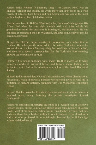 Joseph Smith Fletcher (7 February 1863 - 30 January 1935) was an English journalist and author. He wrote more than 230 books on a wide variety of subjects, both fiction and non-fiction, and was one of the most prolific English writers of detective fiction. Fletcher was born in Halifax, West Yorkshire, the son of a clergyman. His father died when he was eight months old, and after which his grandmother raised him on a farm in Darrington, near Pontefract. He was educated at Silcoates School in Wakefield, and after some study of law, he became a journalist. At age 20, Fletcher began working in journalism, as a sub-editor in London. He subsequently returned to his native Yorkshire, where he worked first on the Leeds Mercury using the pseudonym A Son of the Soil, and then as a special correspondent for the Yorkshire Post covering Edward VII's coronation in 1902. Fletcher's first books published were poetry. He then moved on to write numerous works of historical fiction and history, many dealing with Yorkshire, which led to his selection as a fellow of the Royal Historical Society. Michael Sadleir stated that Fletcher's historical novel, When Charles I Was King (1892), was his best work. Fletcher wrote several novels of rural life in imitation of Richard Jefferies, beginning with The Wonderful Wapentake (1894). In 1914, Fletcher wrote his first detective novel and went on to write over a hundred more, many featuring the private investigator Ronald Camberwell. Fletcher is sometimes incorrectly described as a "Golden Age of Detective Fiction" author, but he is in fact an almost exact contemporary of Conan Doyle. Most of his detective fiction works considerably pre-date that era, and even those few published within it do not conform to the closed form and strict rules professed, if not unfailingly observed, by the Golden Age writers. (wikipedia.org)