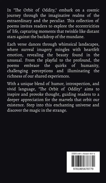 In "The Orbit of Oddity," embark on a cosmic journey through the imaginative realms of the extraordinary and the peculiar. This collection of poems invites readers to explore the eccentricities of life, capturing moments that twinkle like distant stars against the backdrop of the mundane. Each verse dances through whimsical landscapes, where surreal imagery mingles with heartfelt emotion, revealing the beauty found in the unusual. From the playful to the profound, the poems embrace the quirks of humanity, challenging perceptions and illuminating the richness of our shared experiences. With a unique blend of humor, introspection, and vivid language, "The Orbit of Oddity" aims to inspire and provoke thought, guiding readers to a deeper appreciation for the marvels that orbit our existence. Step into this enchanting universe and discover the magic in the strange.