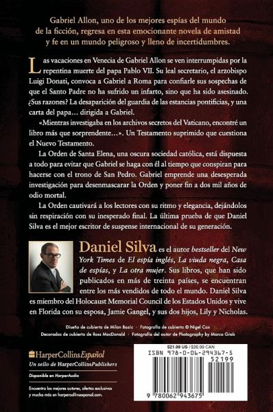 Gabriel Allon, uno de los mejores espías del mundo de la ficción, regresa en esta emocionante novela de amistad y fe en un mundo peligroso y lleno de incertidumbres. Las vacaciones en Venecia de Gabriel Allon se ven interrumpidas por la repentina muerte del papa Pablo VII. Su leal secretario, el arzobispo Luigi Donati, convoca a Gabriel a Roma para confiarle sus sospechas de que el Santo Padre no ha sufrido un infarto, sino que ha sido asesinado. ¿Sus razones? La desaparición del guardia de las estancias pontificias, y una carta del papa... dirigida a Gabriel. «Mientras investigaba en los archivos secretos del Vaticano, encontré un libro más que sorprendente...». Un Testamento suprimido que cuestiona el Nuevo Testamento. La Orden de Santa Elena, una oscura sociedad católica, está dispuesta a todo para evitar que Gabriel se haga con él al tiempo que conspiran para hacerse con el trono de San Pedro. Gabriel emprende una desesperada investigación para desenmascarar la Orden y poner fin a dos mil años de odio mortal. La Orden cautivará a los lectores con su ritmo y elegancia, dejándolos sin respiración con su inesperado final. La última prueba de que Daniel Silva es el mejor escritor de suspense internacional de su generación. DANIEL SILVA es el autor bestseller del New York Times de El espía inglés, La viuda negra, Casa de los espías, y La otra mujer. Sus libros, que han sido publicados en más de treinta países, se encuentran entre los más vendidos de todo el mundo. Daniel Silva es miembro del Holocaust Memorial Council de los Estados Unidos y vive en Florida con su esposa, Jamie Gangel, y sus dos hijos, Lily y Nicholas.