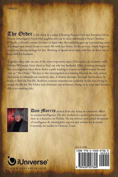 The Order is the third in a series following Beyond Evil and Runaway Mom. Private Investigator Frank McLaughlin sets out to elicit information from Charlene O'Keefe, a friend's cousin, in order to learn why she suddenly gave up a promising career as a singer and return home to ranch life with her father. In the process, Frank begins to experience strong feelings for her. Wanting to spend more time with her, he hires her to help with his business. Together, they take on one of the most important cases of his career. A minister's wife, Felicity Whitman, hires them to find out why her husband, Matt, is acting strangely. The investigation takes them down a path leading to a secret political society known only as "The Order." The key to the investigation is a missing file and the only person that knew its whereabouts suddenly dies. A bizarre attempt, through Spiritualism, is made to find the lost file. Ruthless contract assassins are suddenly in the mix trying to secure the file for The Order and eliminate any witnesses. Hang on to your seats because this is an exciting ride.