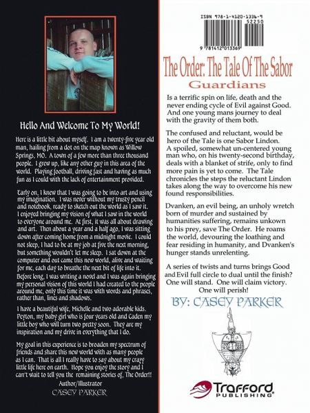 The Order: The Tale Of The Sabor Guardians is a terrific spin on life, death and the never ending cycle of Evil against Good, and one young man's journey to deal with the gravity of them both. The confused and reluctant be hero of the Tale is one Sabor Lindon, a spoiled, somewhat uncentered young man who on his twenty-second birthday deals with a blanket of strife - only to find more pain is yet to come. The Tale chronicles the steps the reluctant Lindon takes along the way to overcome his newfound responsibilities. An evil being, Dvanken, an unholy wretch born of murder and sustained by humanity's suffering, remains unknown to all of mankind, save The Order. He roams, devouring the loathing and fear residing in humanity and his hunger stands unrelenting. A series of twists and turns bring Good and Evil full circle to duel until the finish. One will stand. One will claim victory. One will perish! "The author of The Order paints a vivid picture which allows you to enter into a new world, a world which will amaze and fascinate you, as he introduces you to the world and the inhabitants of The Order." - Bev Whittingham, author of Sunrise "This talented and imaginative young author invents his own dimension within our own. Sabor Guardians commit terrifying acts of heroism to fight an enormous terror, plaguing the earth. The terror known as Dvanken." - Debra Moore