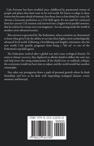 Cole Forrester has been troubled since childhood by paranormal visions of people and places that don't exist in his real world. He learns to adapt to these visions but becomes afraid of intimacy lest those close to him think he's crazy. He chooses a lonesome profession as a CIA field agent. It's not until he's extracted from his current CIA mission and inserted into a higher-level parallel universe, that he realizes his visions were not imaginary—he was seeing inside the world of another, more advanced society. This universe is governed by The Federation, whose scientists are determined to learn what gives Cole the ability to see into their higher, more technologically advanced level world. Following a bewildering and lengthy orientation into his new world, Cole quickly progresses from being a "lab rat" to one of the Federation's top field agents. The Federation evolved after a global war and a near ecological disaster. To assist in climate recovery, they deployed an albedo shield to deflect the sun's rays and help lower the rising temperatures. If the shield were to suddenly collapse, the ecosystems would not have time to adjust, and the world would face another catastrophe. Fate takes our protagonist down a path of personal growth where he finds friendship and love as he deals with impending ecological disaster, covert missions, and betrayal.